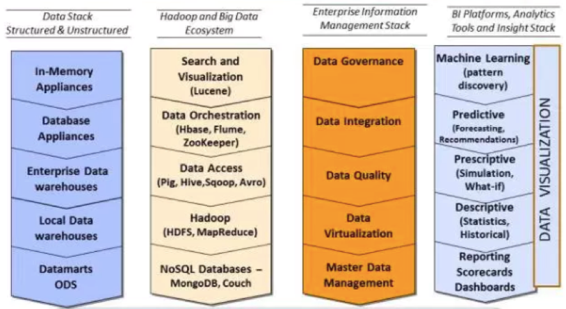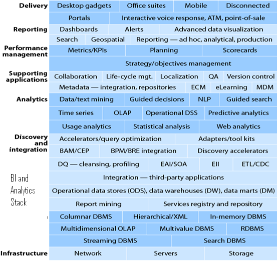 While we discussed the not technical aspects, it is prudent we also talk about typical deployment (Read, logical schematic) stack. The aspects that drive the BI are now seen interwoven with modern open source tools that are largely crowdsourced developed to solve much larger and much wider use cases...here is a nice illustration from Wiki, the verticals cater to different tenets of BI, Analytics toolsets and solutions.Each block represents a competency and varied options are now streaming to solve the use cases catering to each stage, as said earlier there are players who offer end to end respite and there are specific verticals that align to niche domains or verticals in the transformation process, for few tech savvy enterprises who are willing to invest and build the ecosystem themselves there are open source technologies or components to focus on refinements, all in all the complexities and evolution is fast paced and expeditiously expanding most of the times. The face of change is dominating the underlying technology and business users are averse in knowing what it runs on or where it runs on as long as it meets the security standards and efficient for access and ability thereof.