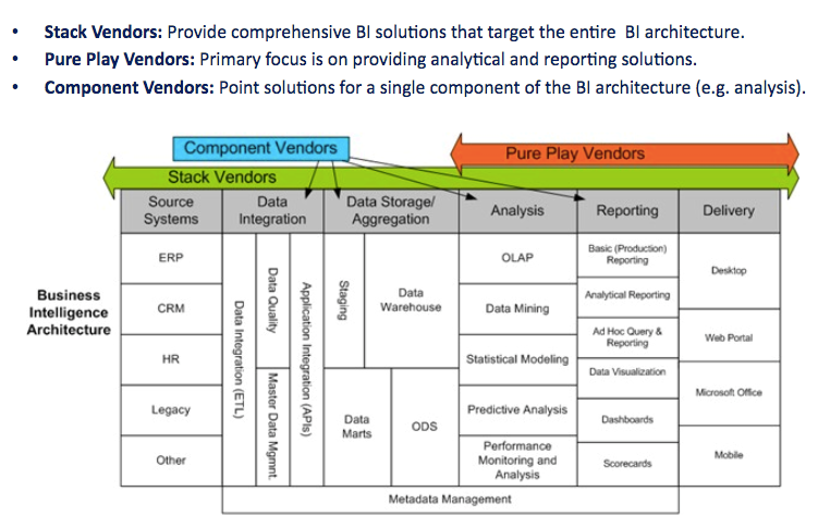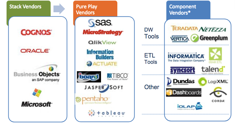 There are three key verticals we can segregate the BI enablers, the "End to End" stack vendors, The "Pure Play Vendors" and finally component vendors, it is left to the businesses to determine how they wish to engage and evolve their BI journey and stay relevant to technologies / markets and dynamic needs of the business. The following depiction can help map the market and the players but caution, this is an evolving field and most disruptive context within and outside the ecosystem thus lot of innovation and highly integrated solutions lurk in from nowhere and drive the changes, the open source stacks are as fast evolving to dilute to boundaries and go beyond the known limitations.