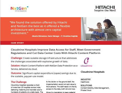 "We found the solution offered by Hitachi and NxtGen the best as it offered a flexible architecture with almost zero capital investment." Cloudnine Hospitals Improve Data Access for staff.Meet Government Regulations and Cut Data Center Costs with Hitachi Content platform. |