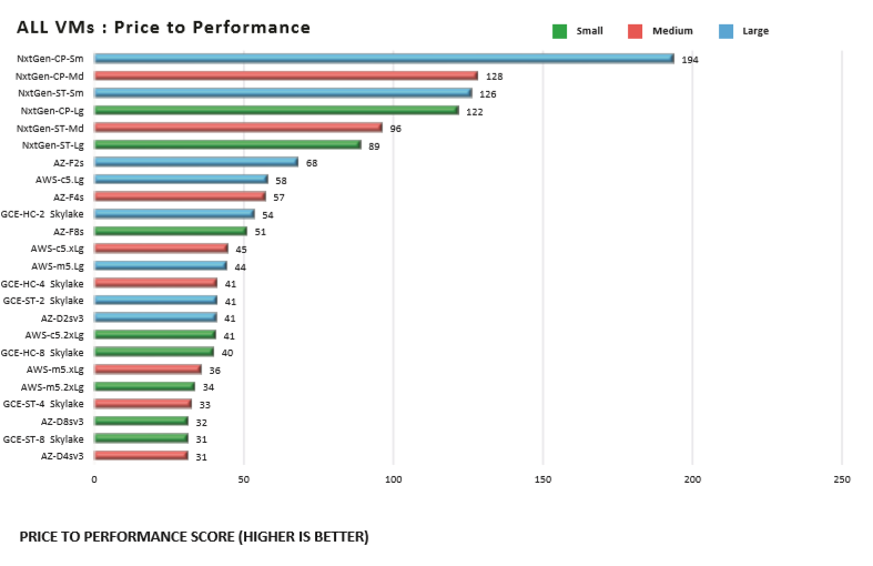 The CPU and memory performance by all NxtGen VMs was impressive, given its use of Intel Xeon Gold 6152 CPU's. Only Azure's Fs series VMs were able to approach NxtGen's CPU performance, achieving roughly 80% in the compute-optimized class. However, NxtGen clearly stood apart in the standard VM category.
